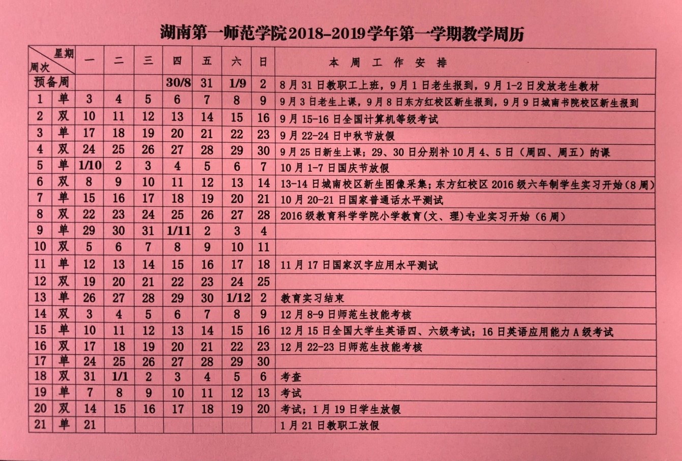 2018-2019学年第一学期教学周历