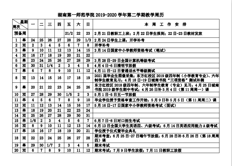 2019-2020学年第二学期教学周历