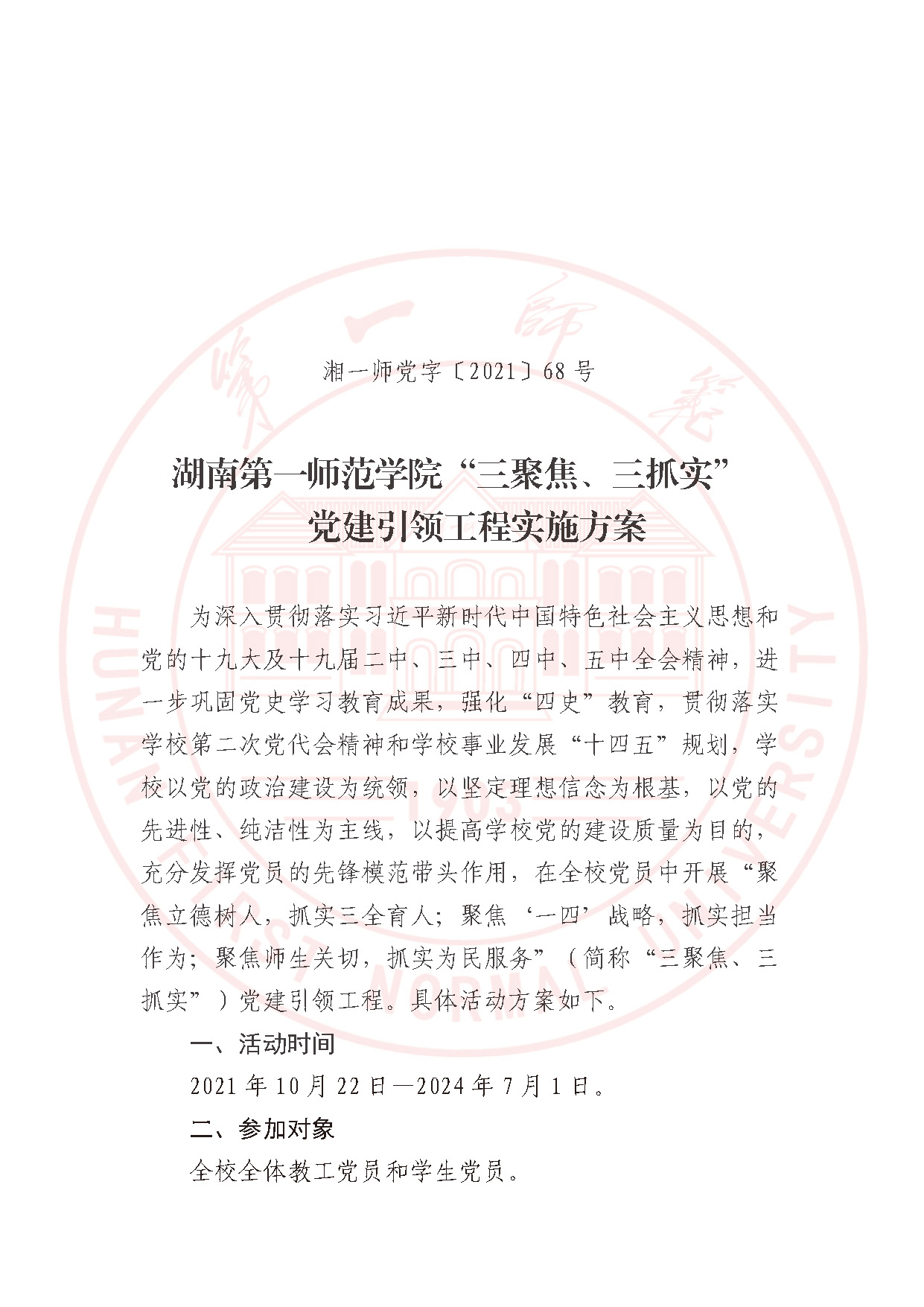 湘一师党字〔2021〕68号 bevictor伟德官网“三聚焦、三抓实”党建引领工程实施方案